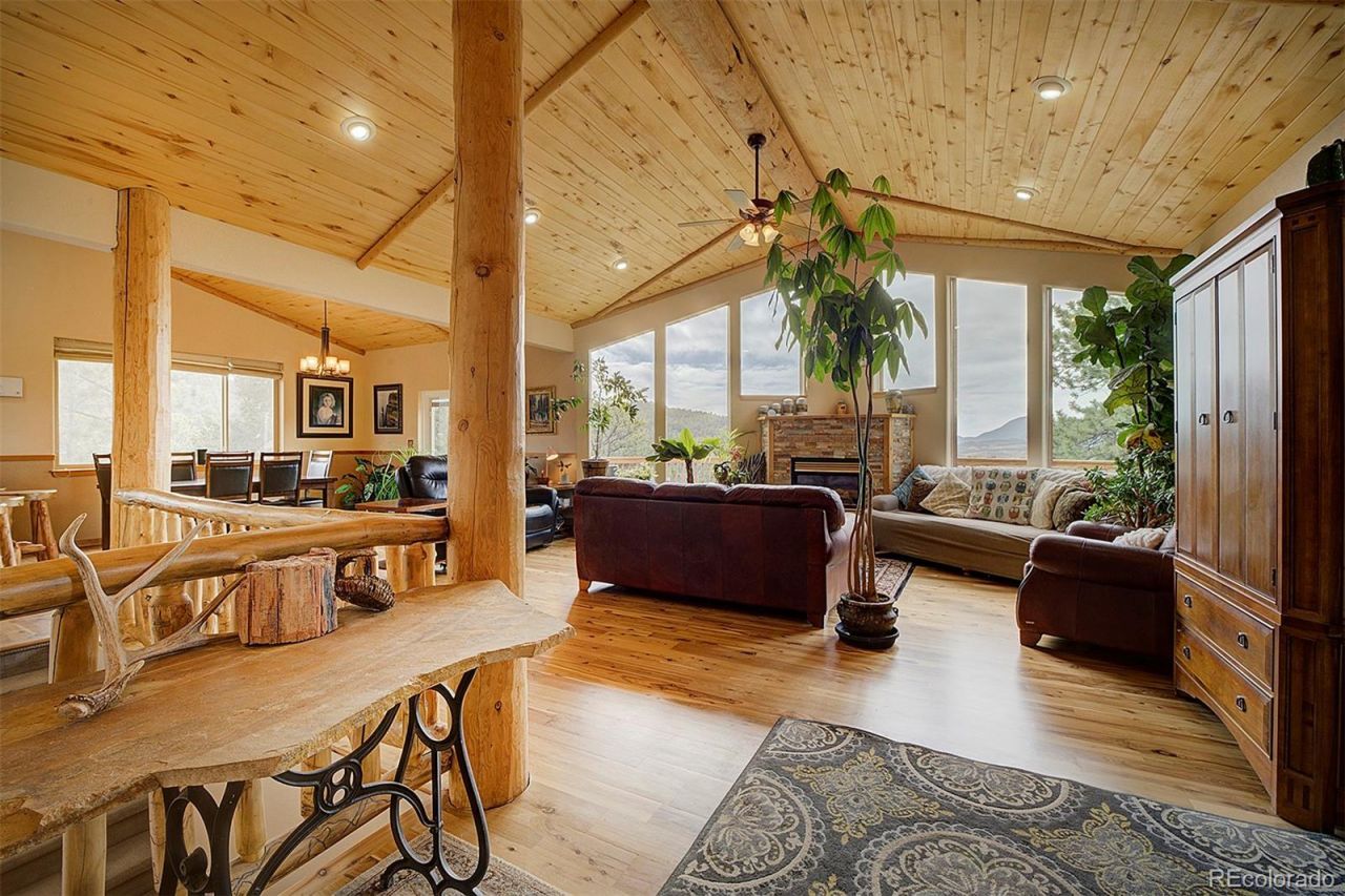 50-MILE SNOWCAP VIEWS from Pikes Peak to Mount Rosalie define this exceptional 5-acre mountain property, offering rare quality and value under $1M. Tucked at the end of a peaceful cul-de-sac, this beautifully maintained builders home blends custom touches and warmth with thoughtful modern efficiency. Expansive windows in the great room frame breathtaking vistas, creating a seamless connection between indoors and out. Tile and newly refinished wood floors complement vaulted wood ceilings and custom trim throughout. The kitchen features granite counters, stainless appliances, abundant workspace and stunning custom cabinetry. Designed for comfort and efficiency, the home incorporates passive solar orientation and a new energy-efficient 8-zone boiler providing in-floor radiant heat. In late 2024, all buildings received new roofs, with updated gutters and downspouts on the main home. Outdoor living shines with expansive deck spaces for sun and shade, professionally landscaped native plantings, flagstone pathways, lichen-covered boulders and towering pines. A new 3-rail cedar fence with integrated coated wire secures pets while preserving natural beauty. Equestrian amenities include a barn/run-in shed, large paddock, 60x100 outdoor arena and pasture. A charming predator-proof chicken coop offers generous space for free-range birds. Enjoy the best of mountain living with convenient access?30 minutes to the western Denver Metro area, 60 minutes to downtown Denver, 70 minutes to DIA and 90 minutes to world-class skiing.