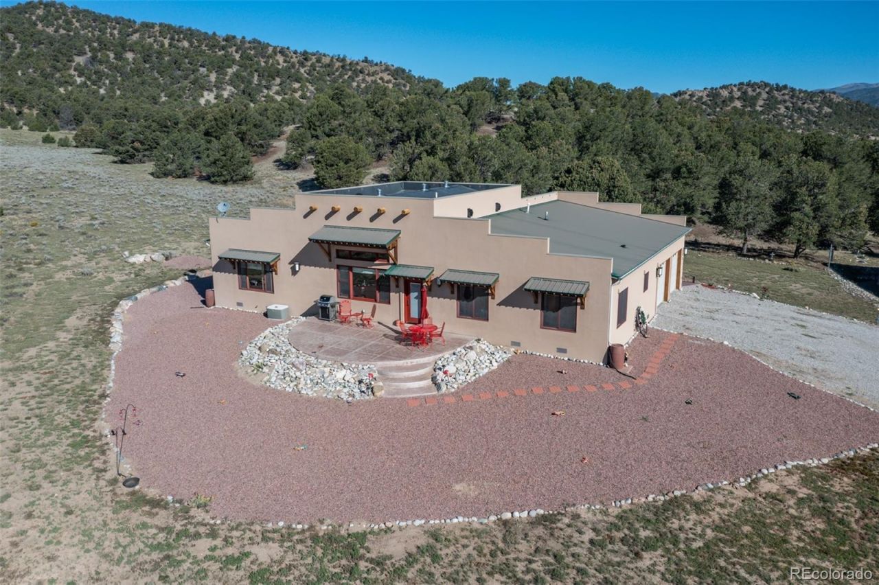 This beautiful custom home on 40 acres is a peaceful and quiet refuge, just 20 minutes east of Salida. Enjoy mountain and valley views and a varied landscape frequented by herds of elk. There is a separate guest house for overflow guests, caregiver, or tenants, with kitchen and 3/4 bath as well as attached garage. The main house features vaulted beetle-kill pine ceiling in the great room and a gas fireplace with hearth custom made from wood harvested from the land. All wood floors and tile with in-floor radiant heat system for warm toes in the winter. A split floor plan allows for a spacious primary suite with stunning views to the south and 36 inch doorways. An office or 4th bedroom is located off the great room as well as a smaller room for multiple uses. On the other side of the house are two bedrooms and a bathroom, as well as the laundry room with ample cabinets and utility sink. There is also a spacious two car attached garage and solar panels mean electric bills are kept to a minimum. Serenity and space awaits!
