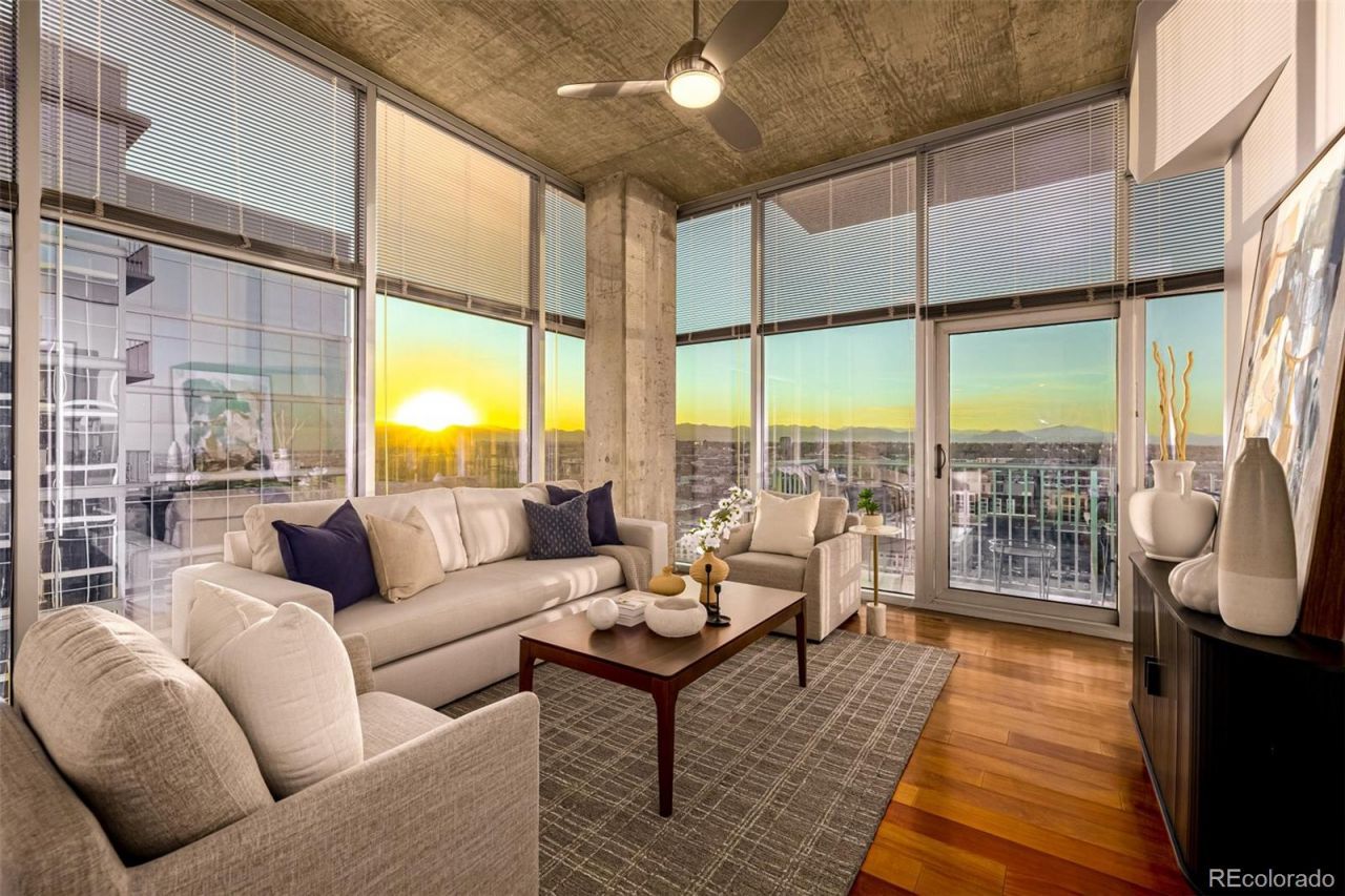 Looking for mountain views? Enjoy the sunset from the 21st floor, corner residence with floor to ceiling windows. This outstanding 2-bedroom condo is a rare find and will leave you breathless! Sheer beauty and meticulous attention to detail shine throughout, showcasing high-end finishes, a blend of wood & tile flooring, and new plush carpets in the bedrooms. Entertain guests in the impressive open floor plan where comfort meets luxury. The gourmet kitchen is a cooks delight with recessed & pendant lighting, subway tile backsplash, abundant cabinetry, sleek granite counters, a two-tier center island with a breakfast bar, and gleaming stainless steel appliances. The romantic primary bedroom retreat wont disappoint, complete with a walk-in closet and an ensuite that adds convenience to your everyday routine. As a bonus, a washer and dryer are included! The cozy balcony captivates mountain silhouettes and sunset vistas. Great location, close to restaurants, shopping spots, and entertainment. The front desk is available 24/7 with concierge and security, they also take care of dry cleaning pick up delivery, door dash, groceries, Amazon...they are awesome! Out the front door you have access into LoDo, LoHi, I25 and very close to I70. The Glass House is Riverfront Parks only full-amenity building. Highlights include an outdoor lap pool, a club room, two exclusive athletic club memberships, and a front desk. The athletic club is included in the HOA and offers spin, yoga, pilates, and fitness classes for a small fee. The clubhouse level features a large fire pit, barbecue grills, and amazing downtown views (including fireworks from the Rockies games). The condo comes with two parking space and one storage unit. EV Charging can be installed at the parking space for a fee. Minimum rental is 30 days. Riverfront Park Private transfer fee (half of one percent of the sales price) to be paid by buyer.