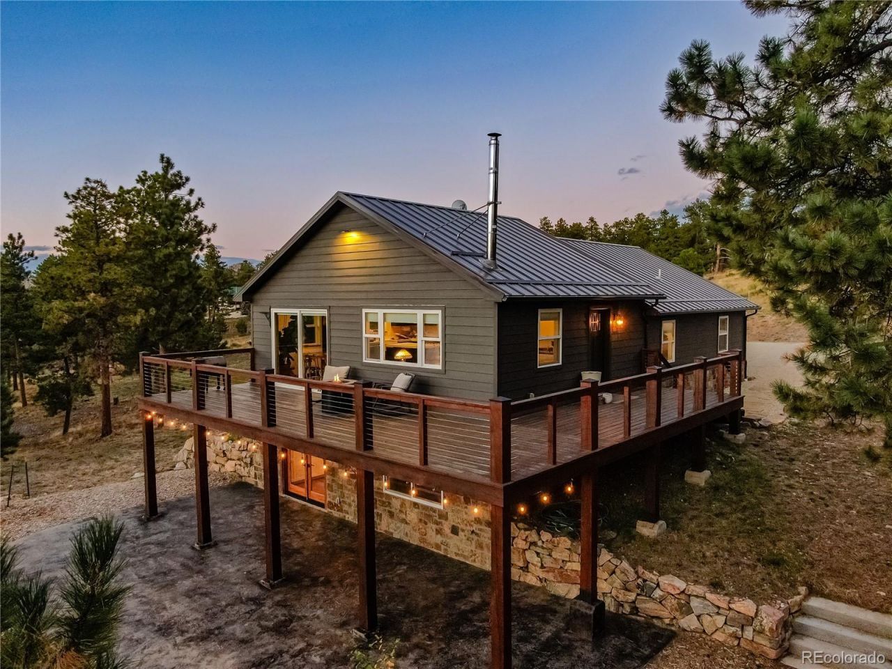 Set on six secluded acres surrounded by towering Ponderosa pines, this fully renovated mountain cabin (built in 2010 & totally renovated in 2019) offers sweeping views of the Sangre de Cristo range and unspoiled forest landscape. The exterior showcases custom stonework, a spacious wraparound deck, and a covered stone patio leading to fire pit. Inside, the open-concept layout centers around a dramatic great room with vaulted, beamed ceilings and a classic wood-burning fireplace. The newly updated eat-in kitchen features stylish finishes and an effortless flow for both daily living and entertaining. The primary suite offers wood-beamed ceilings and a luxurious en-suite bath with a clawfoot tub and spa-like walk-in shower. A dedicated office with built-in shelving, a second bedroom, and a 3/4 bathroom complete the main level. The walkout basement includes a secondary living space, laundry area, and generous storage. Throughout the home, youll find high-end modern touches paired with timeless craftsmanship-from the rich wood flooring to the thoughtfully curated interior details. A rare combination of privacy, comfort, and elevated mountain living.