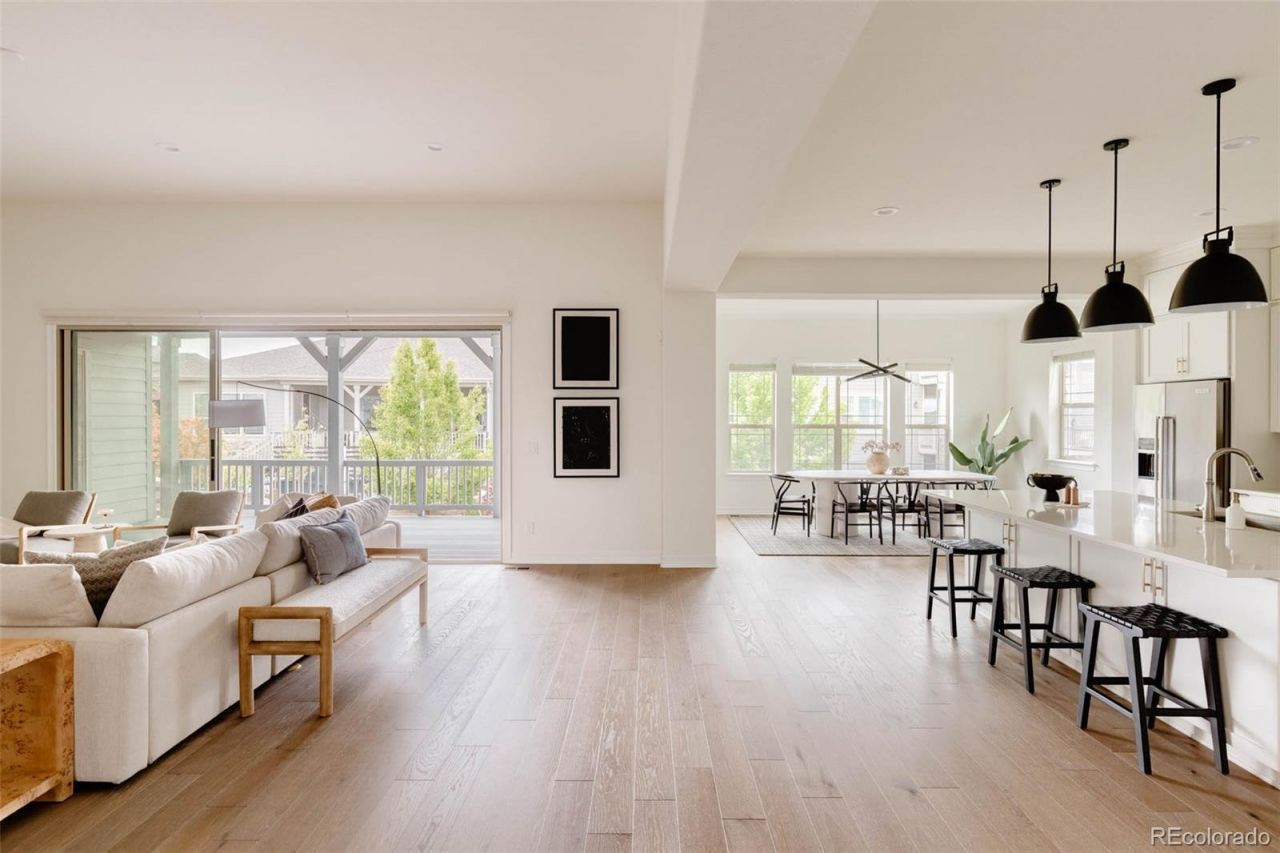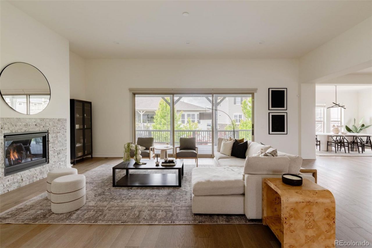 Nestled between 2 resort-style clubhouses & pools, & part of the award-winning Cherry Creek School District, this home offers the best of Colorado living w/scenic trails, vibrant parks, state-of-the-art fitness centers, & the Aurora Reservoir steps away. Inside, the great room impresses with soaring 12ft ceilings & a stunning 15ft stacked slider to access an extended patio, while the dining area has a picturesque view of the reservoir. A gas fireplace with tile surround anchors the space, complemented by engineered wide-plank oak floors & recessed LED lighting throughout. The kitchen shines w/ stacked white cabinetry to the ceiling, quartz countertops, designer lighting, an extended island perfect for entertaining, & upgraded stainless steel appliances including a gas range. A large pantry completes the space. The main level features a secondary bed w/ its own en-suite bath, providing comfort & privacy for guests or family. An additional bedroom with French doors can be used as a study, showcasing water views for an ideal work-from-home retreat. The primary suite is a sanctuary with a luxurious en-suite bath boasting double vanities, upgraded countertops, a large walk-in shower with floor-to-ceiling tile, a soaking tub & a large walk-in closet. The convenient mud/laundry room enhances daily organization. The garden-level unfinished basement is bright with six large windows & ready for your custom vision, including plumbing rough-in. Upgrades include custom blinds, enhanced sound & garage insulation, gas fireplace fan, in-line humidifier, & radon detection system. The 3-car garage is pre-wired for an EV charger; the backyard is wired for a swim spa or hot tub. Outdoors, enjoy a beautifully landscaped yard w/ dual retaining walls & a custom water runoff channel. Relax on an expanded rear deck w/water views. The deck has a gas line, perfect for grilling, while a hot/cold hose bib in the front yard adds convenience. South-facing driveway ensures easy snowmelt in winter.