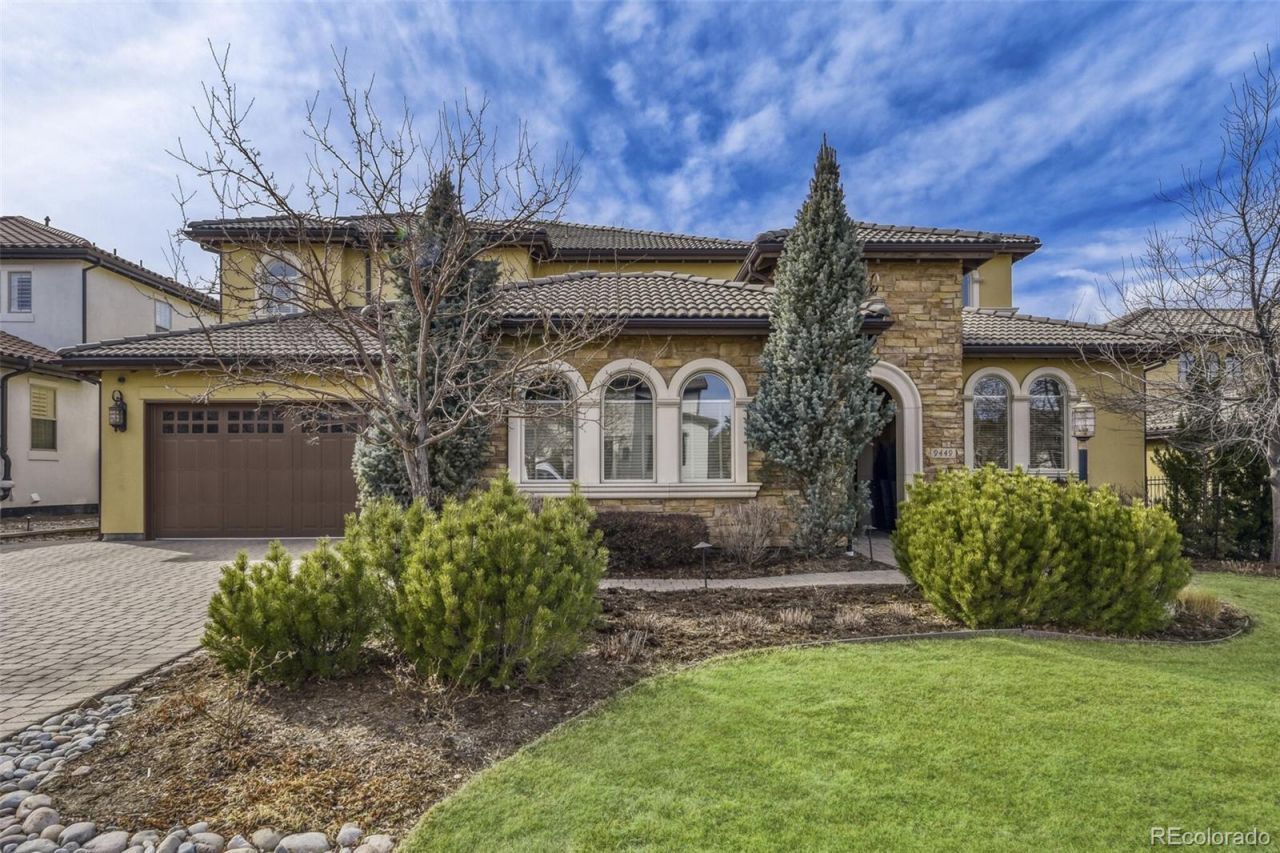 WELCOME to the beauty, privacy, and prestige of the exclusive, gated Heritage Hills community?featuring a neighborhood swimming pool. Tucked on a quiet cul-de-sac, this immaculate Mediterranean-style home offers 5 bedrooms, 5 bathrooms, plus a main floor office and showcases an enhanced stucco exterior, lush landscaping, paverstone driveway, and gated courtyard. Beautifully remodeled with expanded and refinished real oak flooring, plush carpeting, pull-trowel finish, and fresh interior paint, the open-concept layout is ideal for everyday living and entertaining. The family room features a fireplace, a wall of windows, and direct access to the paverstone patio with outdoor fireplace, built-in BBQ grill, and motorized sun screens. The dining room overlooks the courtyard and includes a dry bar with beverage cooler. The remodeled kitchen is a standout with a 48 Wolf range, Thermador convection wall oven and microwave, warming drawer, Tosca farmhouse fireclay sink, new faucet, and quartz countertops. A sun-filled sunroom overlooks the backyard and covered patio, creating seamless indoor-outdoor living. The main floor also includes a redesigned bathroom and private office with decorative paneling. Upstairs, the primary suite captures panoramic mountain views and features a luxurious five-piece bath with clawfoot tub and dual walk-in closets. Three additional bedrooms are upstairs, including one with an ensuite bath, plus a convenient laundry room. The finished basement offers a spacious recreation room with theater area and wet bar, along with a huge fifth bedroom perfect for a guest suite, gym, or craft room. Additional highlights include a three-car garage with floor coating and built-in cabinetry, concrete tile roof, attic fan, and high-efficiency HVAC with 3-zones for complete comfort. Ideally located near I-25, C-470, Charles Schwab, and Sky Ridge Medical Center. Visit the virtual tour at 9449WindingHill.com